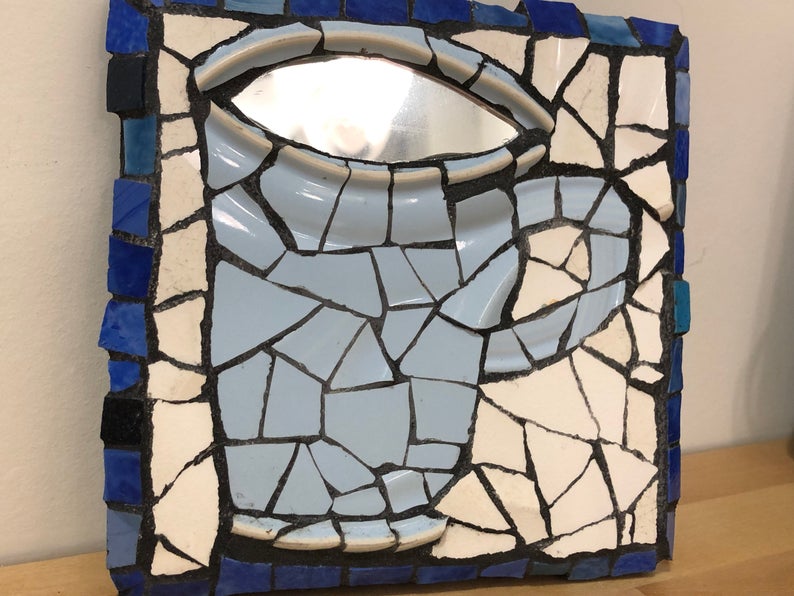 Yes, I am addicted to good coffee. I love creating mosaics that feature coffee cups. Order from my collection of coffee mosaic art online. Get in touch to commission a piece of coffee mosaic art for yourself, to celebrate a wedding, or as a gift, to mark a special event, or a special anniversary for coffee lovers in your life.
