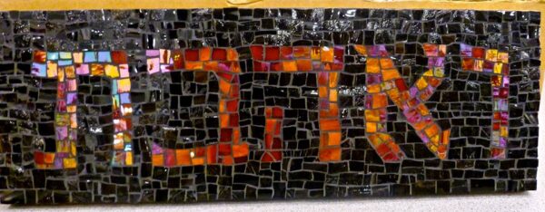 Ve’ahavta mosaic. “And you shall love.” ואהבת is a verb form which occurs continually in Biblical Hebrew, but not in modern Hebrew. Hang this lovely reminder where you’ll see it every day. Perfect for a birthday, anniversary, Bar or Bat Mitzvah gift. Iridescent orange glass on a dark glass background with a yellow glass tile border. Glass on wood. Glass tile border.