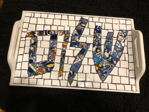 Mosaic of reclaimed Mexican tiles on reclaimed wood.