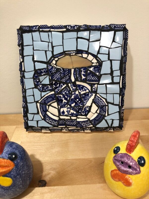 Art for coffee and tea lovers. Is it a cup of coffee? Is it a cup of tea? It’s an eye-catching Willow Ware cup and saucer. Take a sip of beauty. Ceramic and glass on wood. Ceramic tile border. Perfect for the kitchen or breakfast nook.